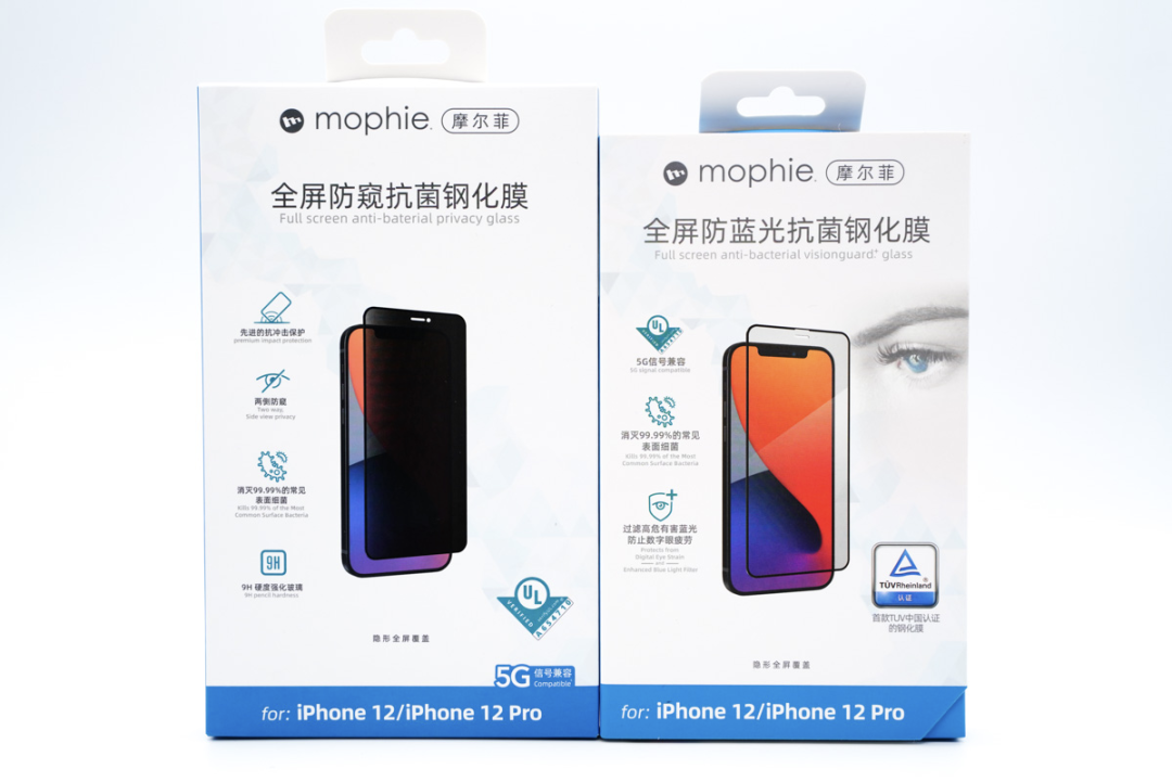 这是mophie为iPhone 12系列推出的钢化膜产品中的两款,分别是mophie全屏防窥抗菌钢化膜和mophie全屏防蓝光抗菌钢化膜。但今天要介绍的主角是左侧这款,也就是mophie全屏防窥抗菌钢化膜。
