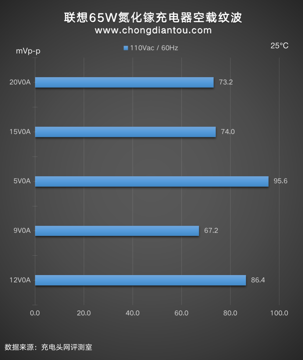 空载情况下:五个档位输出时纹波峰峰值从67.2mVp-p到95.6mVp-p不等。