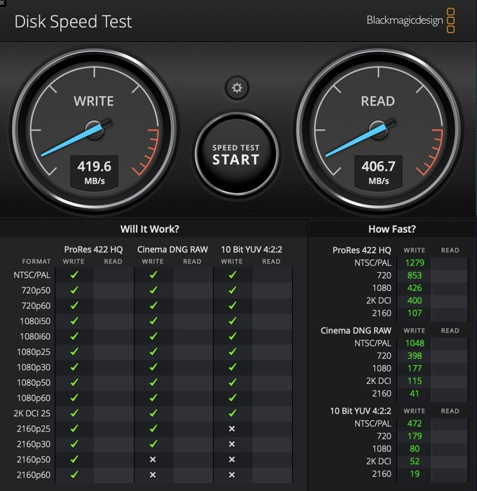 实测写入速度为 419.6MB/s,读取速度为 406.7MB/s。符合 USB 3.0 的数据传输标准。