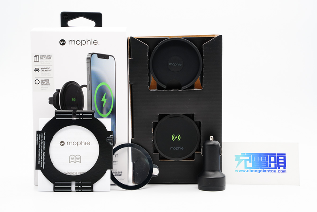 mophie新款车载磁吸充电套装由20W车充、磁吸无线充电器、车载支架以及磁吸贴片组成,磁吸无线充电器此前小编已单独对其进行过评测。得益于套装里面的组件均为独立设计,所以可以释放更多使用场景,车内有线快充、无线充、充当支架、桌面无线充电。