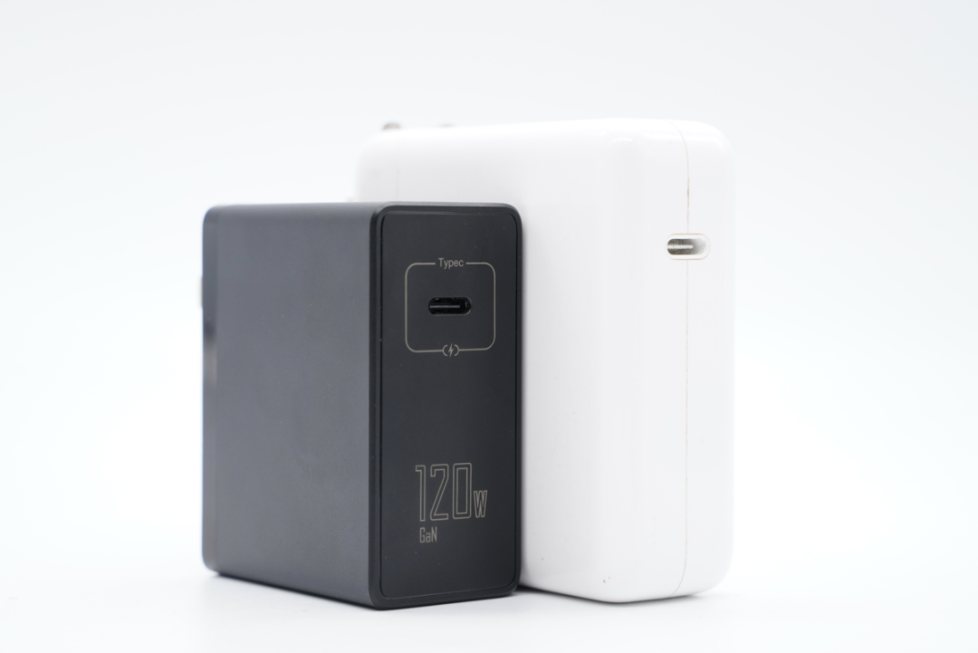 和苹果 96W PD 充电器放在一起对比,努比亚 120W 快充头体积比后者小,功率反而比后者更大。