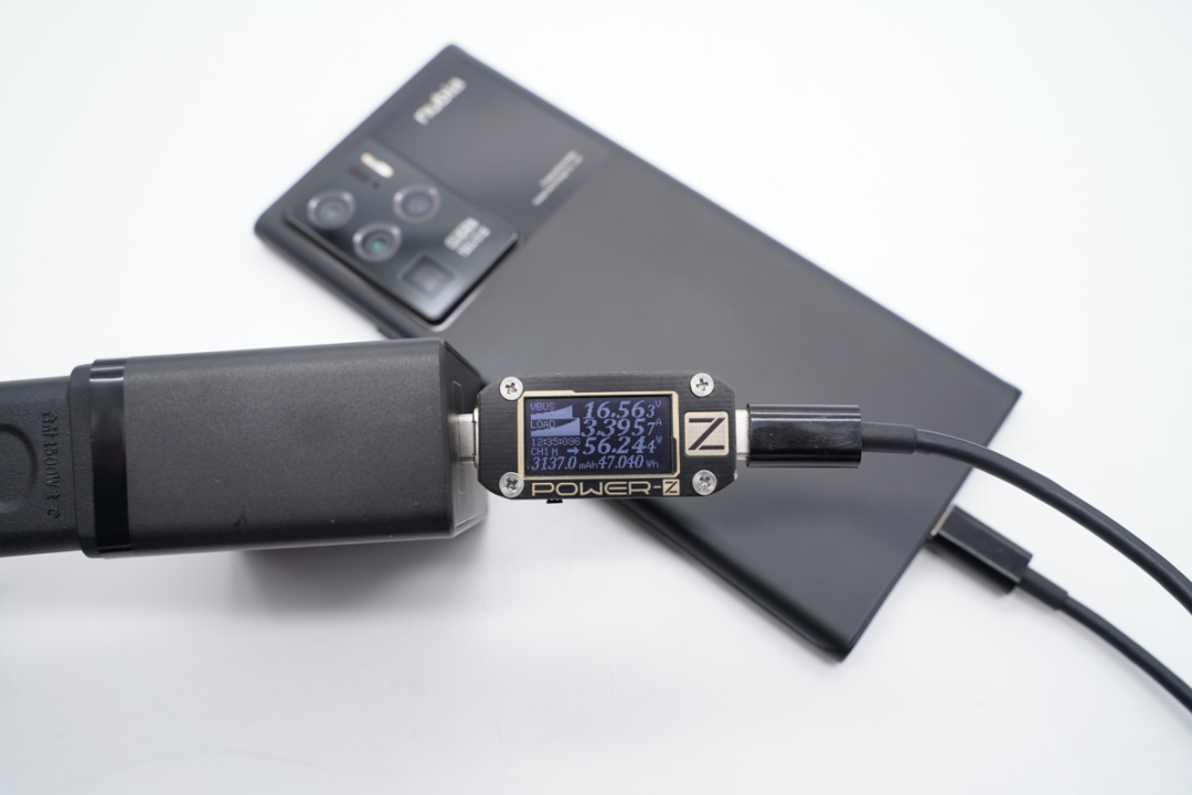 以上测试全部使用原装 6A 线材参与的测试,此次使用原装充电器搭配常规 5A C2C E-Marker 快充线为努比亚 Z30 Pro 充电,实测功率为 16.56V 3.39A 56.24W,可以成功触发 20V 快充档位,但功率相较于原装 6A 线材下降了一半。
