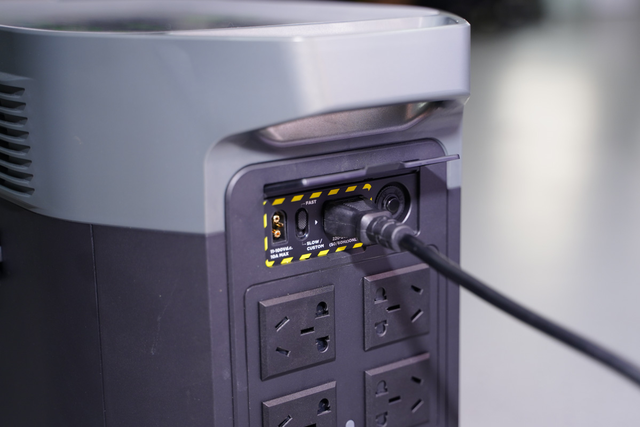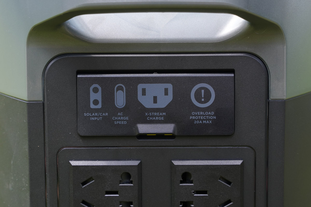EcoFlow正浩 德 DELTA Max 户外电源的接口全部集中在较窄的两个侧面上,先来看一边,整体分为三个区域,中间为 220V AC 交流输出接口,底部为车充输出接口以及 DC 输出接口,每种接口区域均有独立开关控制。