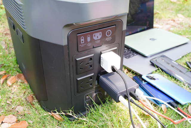 当然,用户也可以使用充电器搭配 220V AC 插座为设备充电,多达 4 个 220V AC 输出接口,搭配多口充电器基本可以满足一家人或者出行小团体的充电需求了。