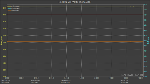 因为EcoFlow 正浩 德 DELTA Max 户外电源配备的 USB-C 接口支持 100W 的输出功率,所以此次小编增设了这一测试数据,以 20V5A 100W 的功率持续输出,可以看出EcoFlow 正浩 德 DELTA Max 户外电源持续工作了 18 个小时以上,并且输出全程非常稳定。
