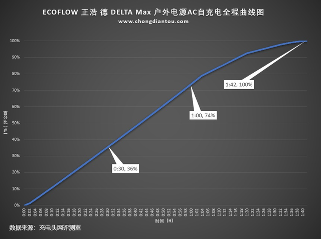 小编采集了使用自带电源线为EcoFlow正浩 德 DELTA Max 户外电源自充电全程的数据,并将其绘制成了曲线图。使用自带电源线为EcoFlow 正浩 德 DELTA Max 户外电源充电时可以提供 1700W+的输入功率,从曲线图上可以看出半小时充电 36%,1 小时充电 74%,完全充满需要 1 小时 42 分。再次提示一下,这是一款内置 2016Wh 电池能量的户外电源。