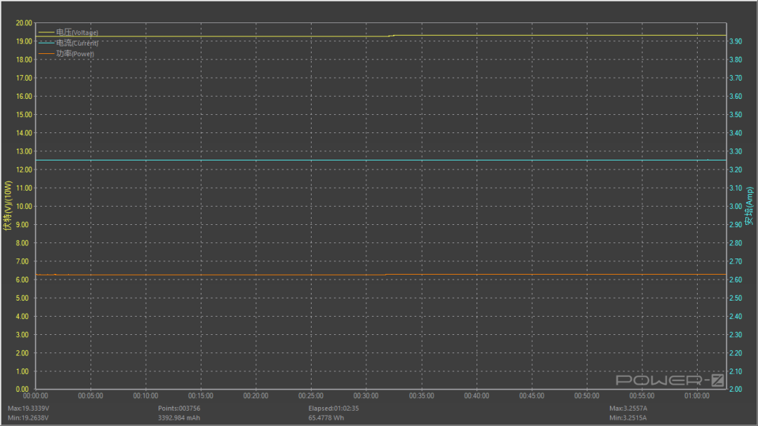 按照额定功率20V 3.25A 65W满载对充电器进行稳定性测试,测试时间为一小时,测试过程中电压值呈水平直线,无明显波动情况,长时间满载比较稳定。