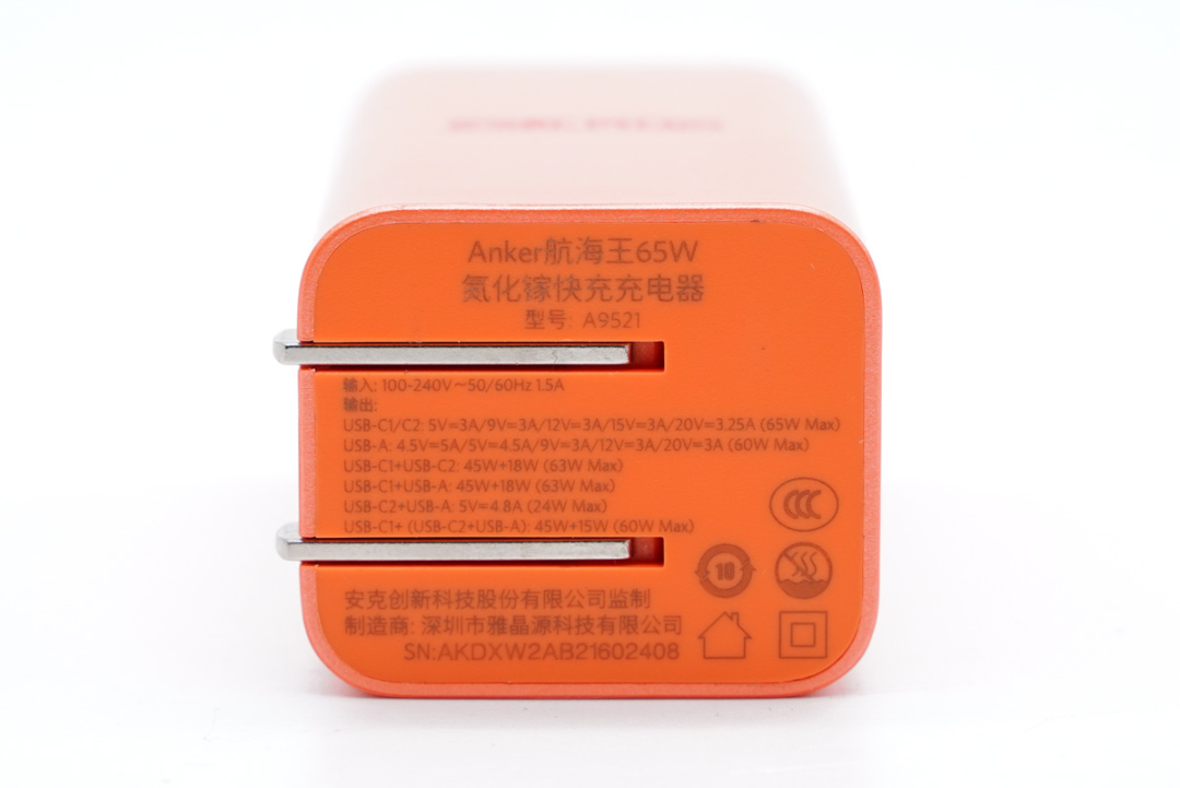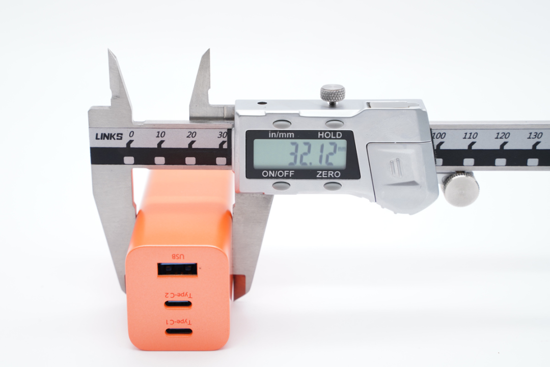 由此可以得出Anker航海王65W氮化镓充电器的三围尺寸为72.63x37.10x32.12mm,充电器的体积约为86.54cm³,以最高输出65W计算,功率密度约为0.75W/cm³。