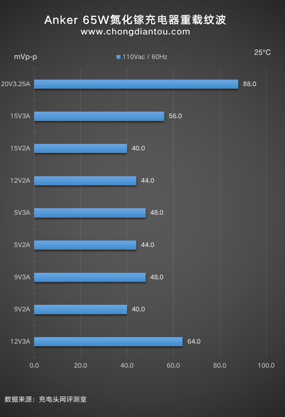 国家标准中充电器纹波要求是不高于200mVp-p,Anker航海王65W氮化镓充电器在110V 60Hz、220V 50Hz输入电压下,所有输出功率纹波峰峰值均低于200mVp-p这个标准,表现不错。