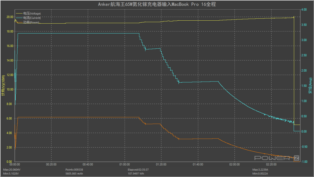 使用Anker航海王65W氮化镓充电器为MacBook Pro 16充电,约1小时07分前功率一直可以保持在62W左右,随后功率和电流开始呈阶梯式的下降状态,全程耗时约2小时32分,最高功率为19.15V 3.22A 61.71W。