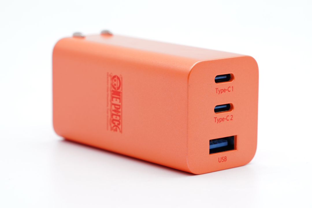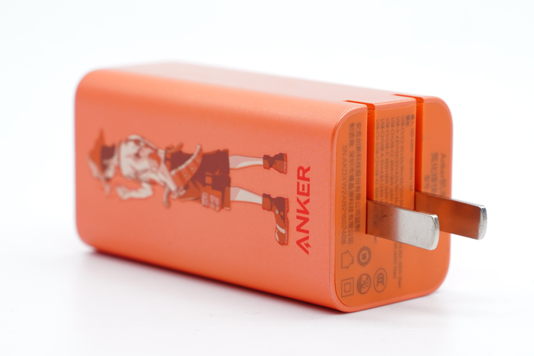 Anker航海王65W氮化镓充电器整个壳体的外观颜色为橘色,正面带有艾斯的动漫外观以及Anker的品牌Logo。