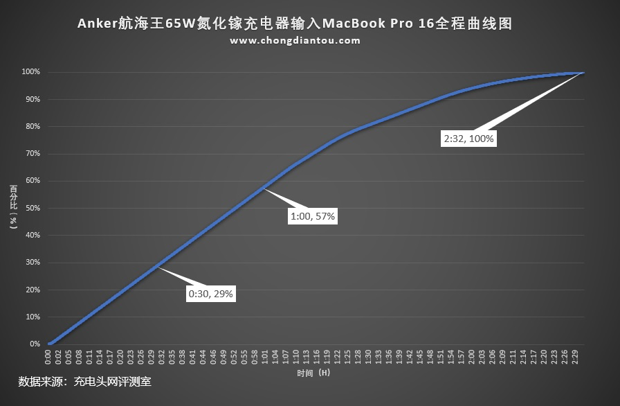 将测试全程绘制成曲线图,Anker航海王65W氮化镓充电器可以为MacBook Pro 16半小时充电29%,1小时充电57%,完全充满需要2小时32分。