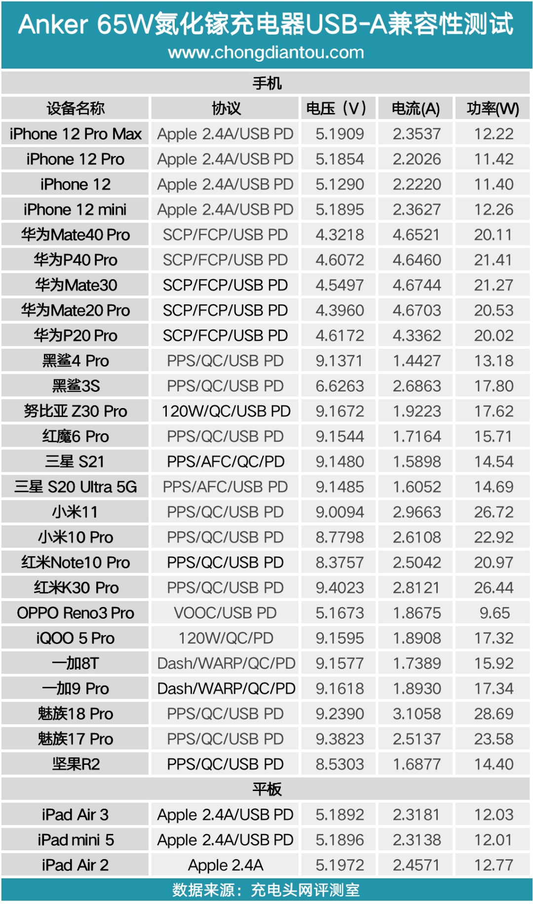测试数据汇总,除iPad Air 2外,其他iPad和笔记本电脑均可以触发15V或者20V快充档位,手机这里几乎清一色的9V快充,整体表现不错。
