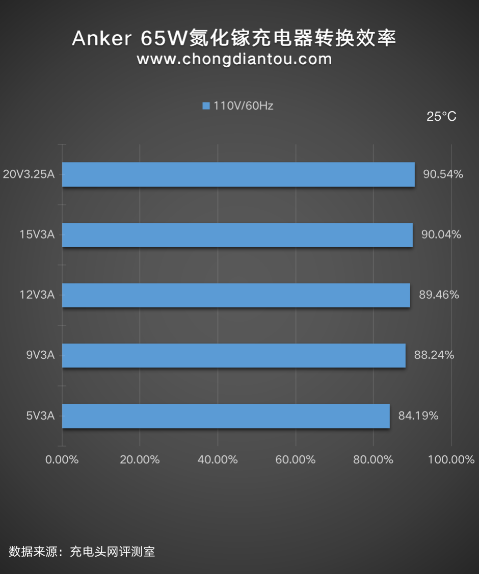 110V 60Hz下,充电器的转换效率从84.19%到90.54%不等。