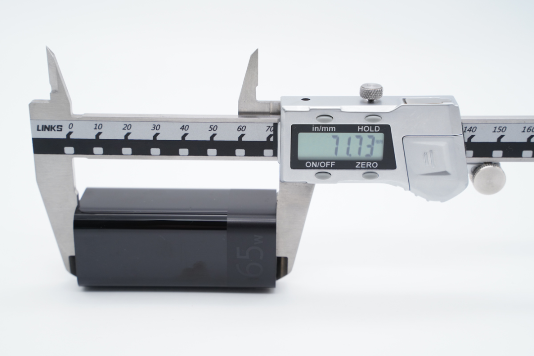 由此可以得出充电器的三围参数为71.73x31.13x31.13mm,充电器的体积约为69.51cm³,以最高输出65W计算,功率密度约为0.93W/cm³。折叠插脚占据了充电器内部的一定空间,不过这样的功率密度在目前的多口氮化镓充电器领域已属领先地位。