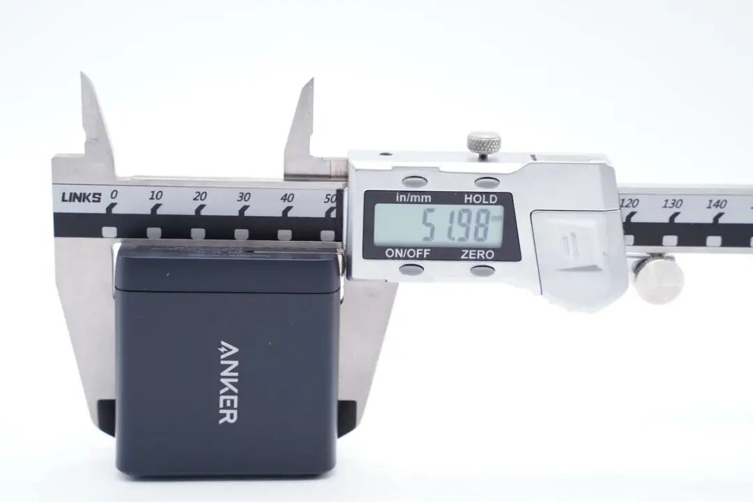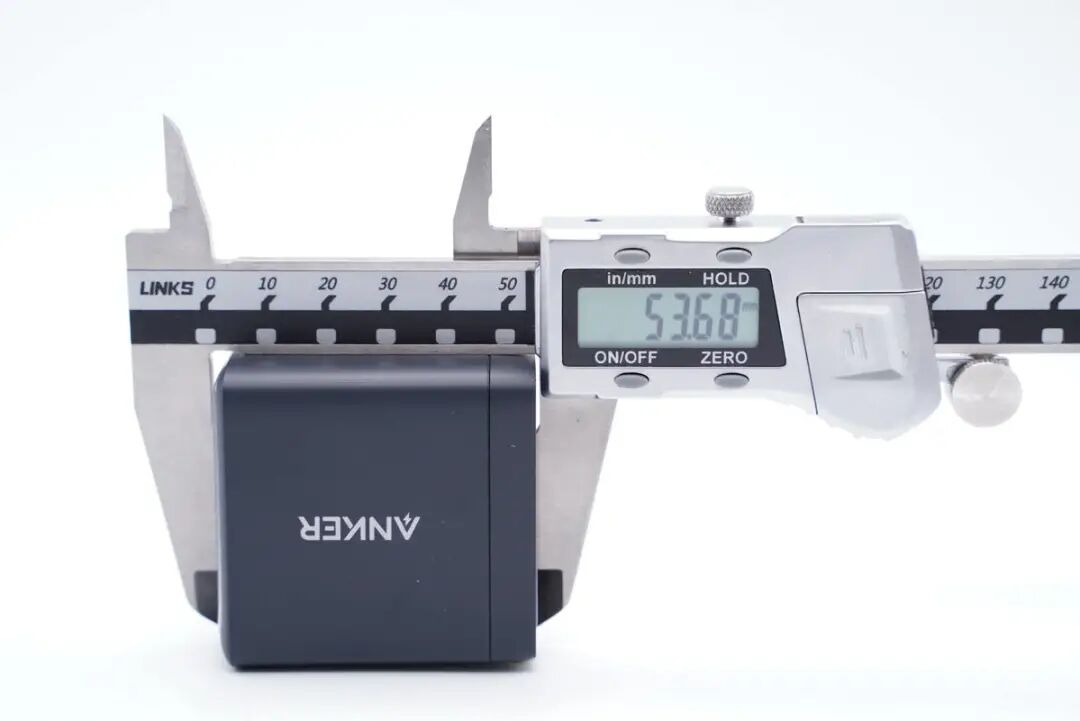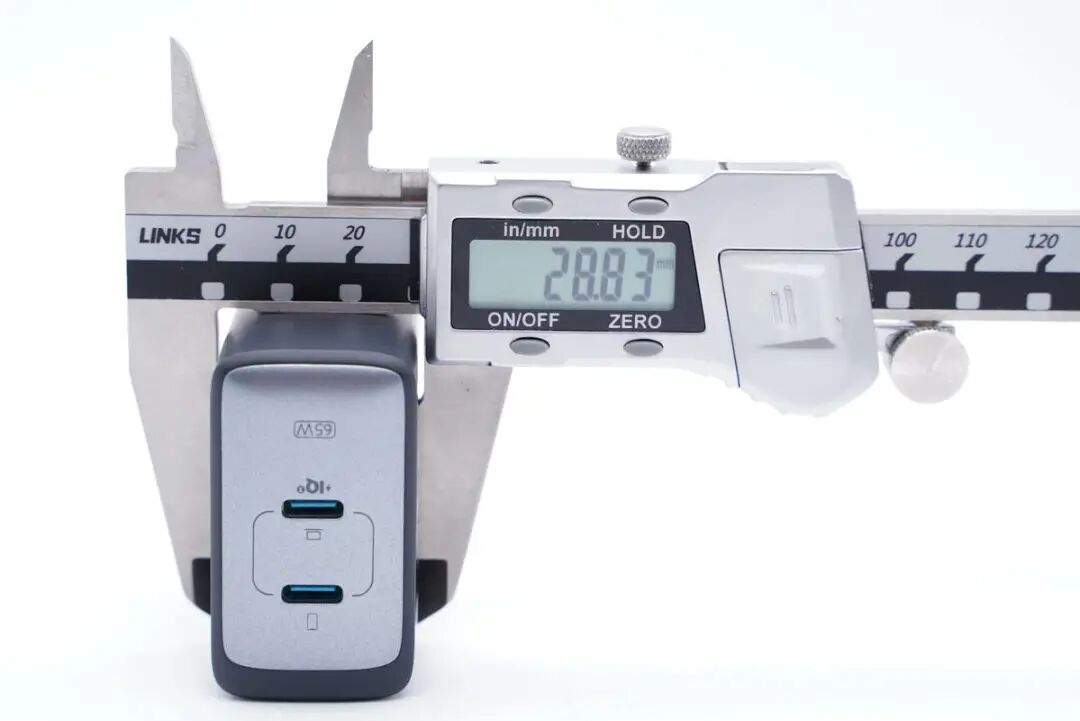 由此可以得出充电器的三维参数约为53.68x51.98x28.83mm,充电器的体积约为80.44cm³,以最高输出65W计算,功率密度约为0.8W/cm³。