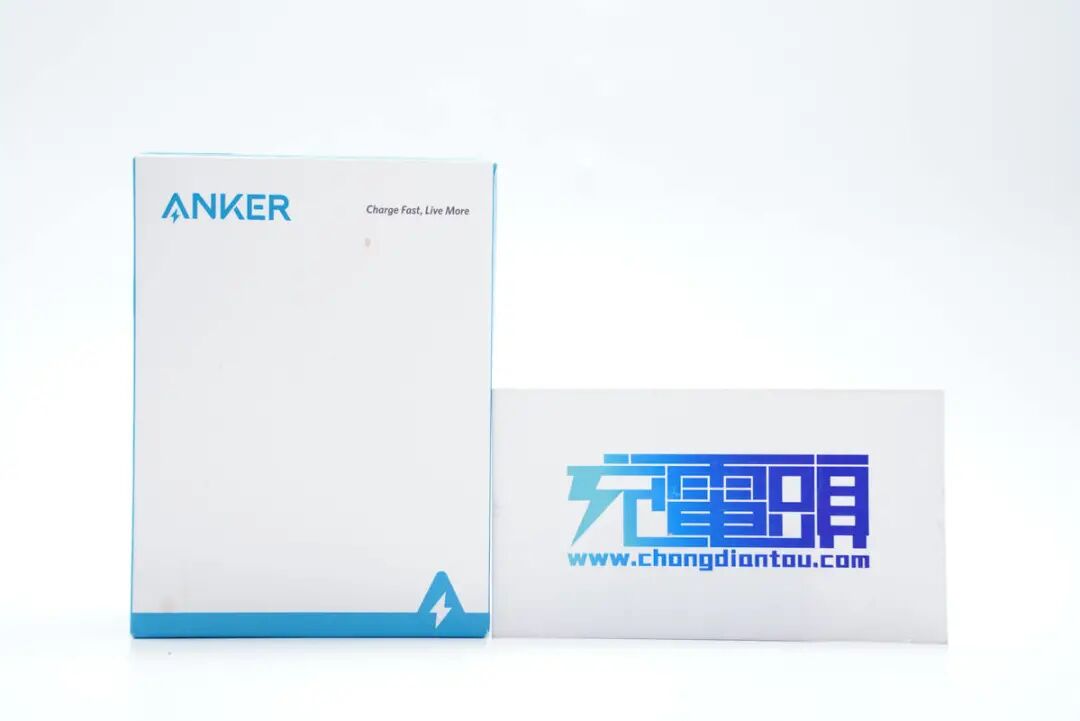 一如既往的Anker安克快充产品系列包装风格,左上角为熟悉的“ANKER”品牌Logo,右侧是Anker安克的Slogan:Charge Fast,Live More。