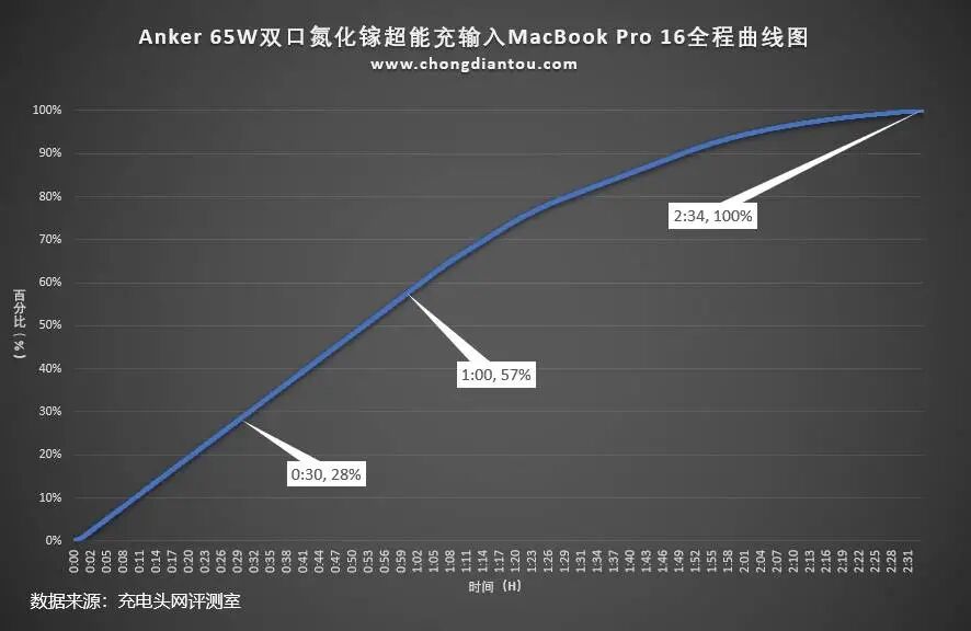将充电全程绘制成曲线图,可以看出充电器为MacBook Pro 16半小时充电28%,1小时充电57%,完全充满需要2小时34分。