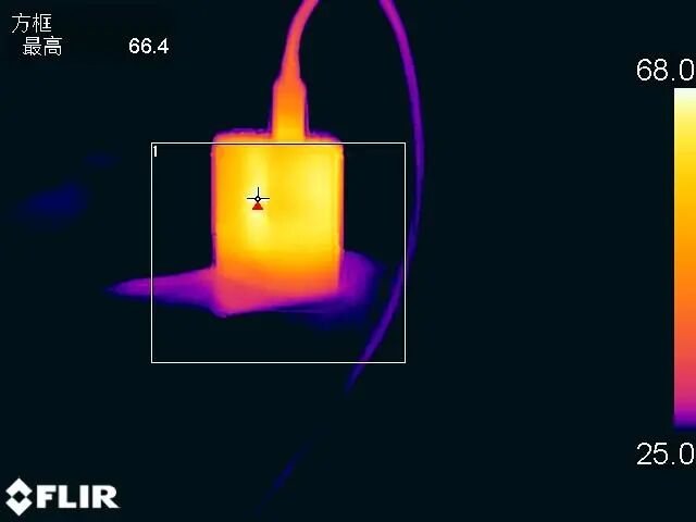 让充电器以20V3.25A 65W的功率持续满载输出1小时后采集到充电器表面的最高温度为66.4℃。