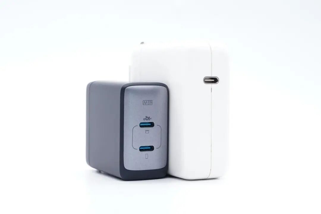 和苹果61W PD充电器放在一起对比一下,Anker安克65W双口氮化镓超能充在功率上要比后者高,且双口应用场景更多。