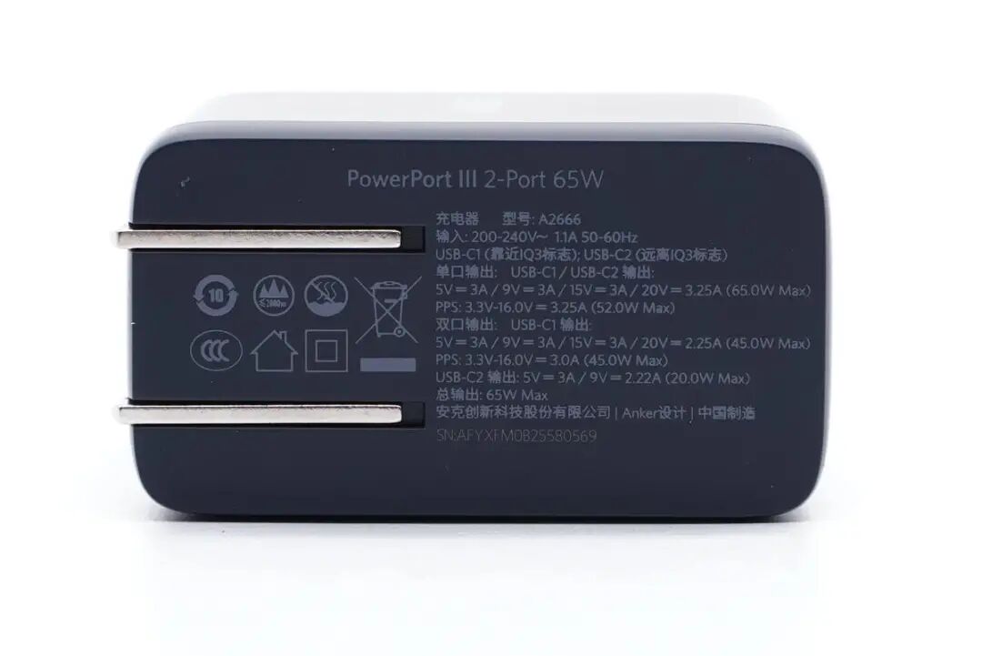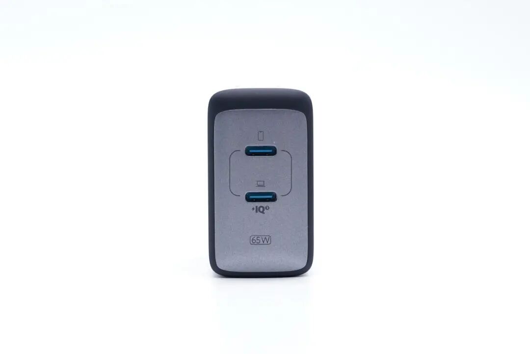 接口部分为双USB-C输出接口,其中靠近IQ3标志的为C1口,远离则为C2口。从接口上面的标志也能判断出来,USB-C1面向的是笔记本电脑充电,USB-C2则是为手机充电。2个C口内部均为蓝色内舌,符合快充的特征,这也是Anker安克快充产品的品牌色了。
