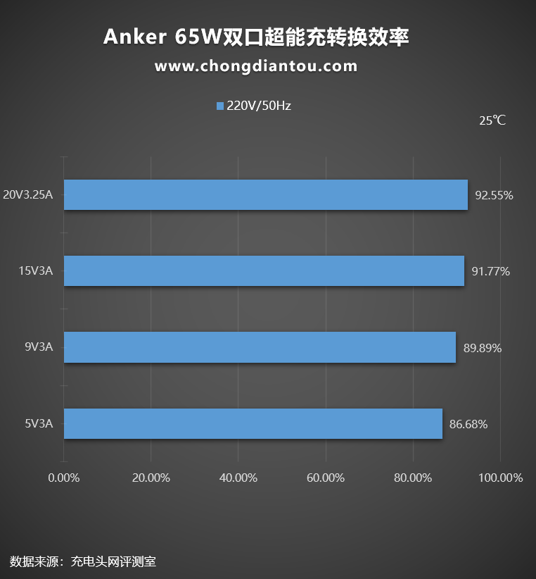 我们平时看充电器上面的参数输出100W或者65W是充电器可以为设备提供的最大输出功率,但充电器从插座上汲取的功率往往要更大一些,下面是Anker安克65W双口超能充在220V 50Hz交流输入的情况下进行的转换效率测试,测试结果如下: