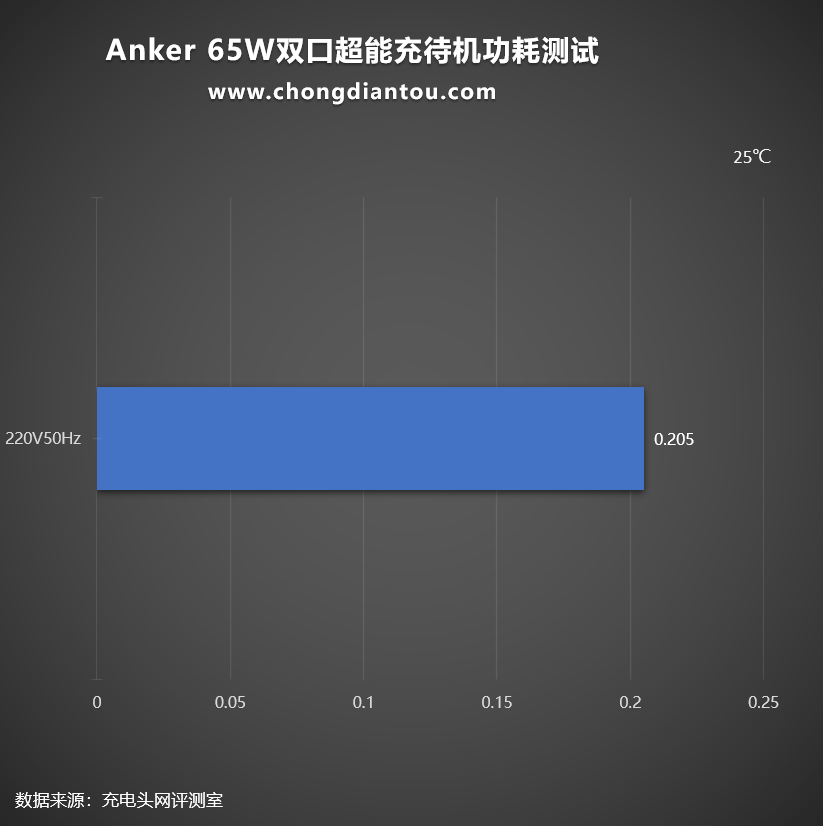 经过功率计测试,Anker安克65W双口超能充在220V 50Hz的空载功耗为0.205W,换算下来一年损耗的电能约为1.79KW·h,若市价电为0.6元/KW·h,则充电器一年的空载功耗约为1.07元左右。