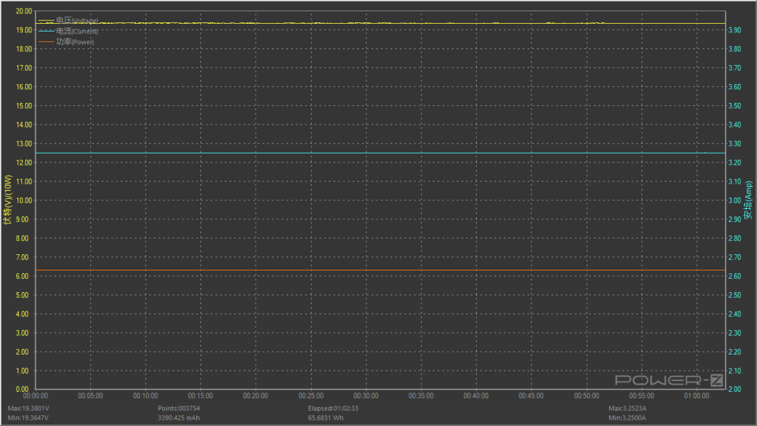 按照额定功率20V 3.25A 65W满载对充电器进行稳定性测试,测试时间为一小时,测试过程中电压值呈水平直线,无明显波动情况,长时间满载比较稳定。