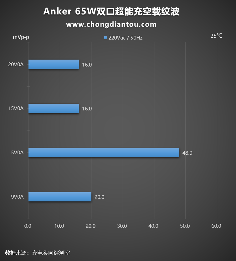 国家标准中充电器纹波要求是不高于200mVp-p,Anker安克65W双口超能充在220V 50Hz输入电压下,所有输出功率纹波峰峰值均低于200mVp-p这个标准,表现不错。