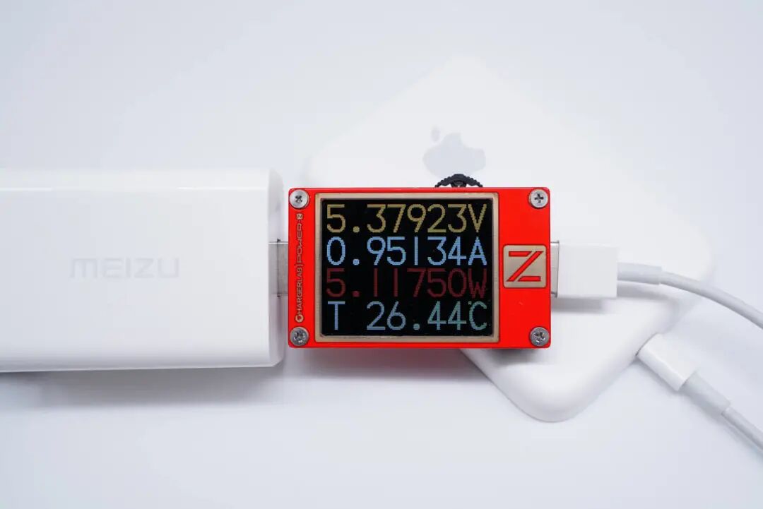 首先使用苹果18W PD充电器为充电宝充电,功率为8.76V 1.92A 16.86W。
