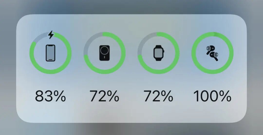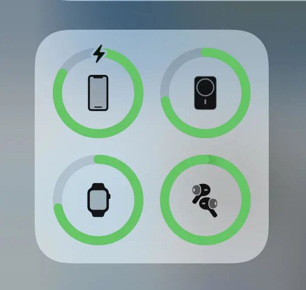 如果同时拥有iPhone 12、Apple Watch、AirPods以及MagSafe充电宝的话,就可以在系统自带的电池小组件里直接查看各个设备的电量情况。