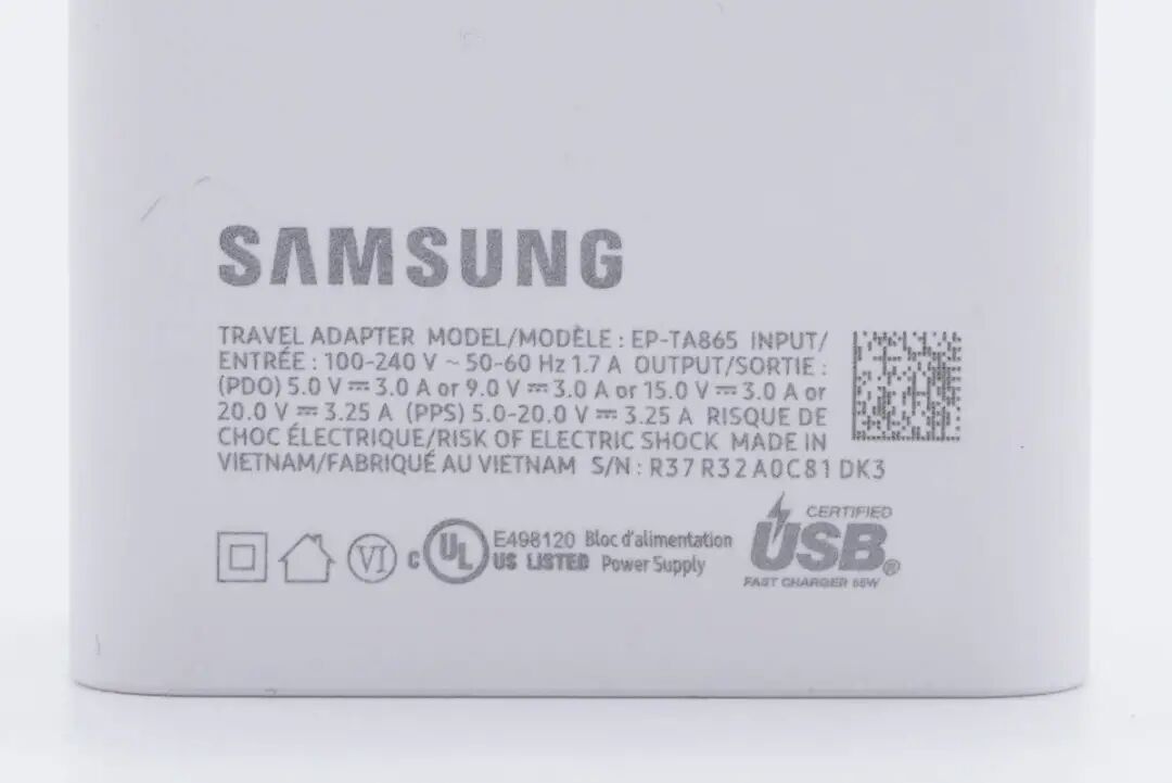 这大概是三星为数不多的大功率充电器了,三星65W充电器采用常规的外观设计,固定美规插脚,配备单USB-C物理输出接口。性能方面支持5V、9V、15V、20V四个输出档位,最高65W输出功率,并且配备3.3-11V5A、3.3-16V4.3A、3.3-21V3.25A三个PPS快充档位。