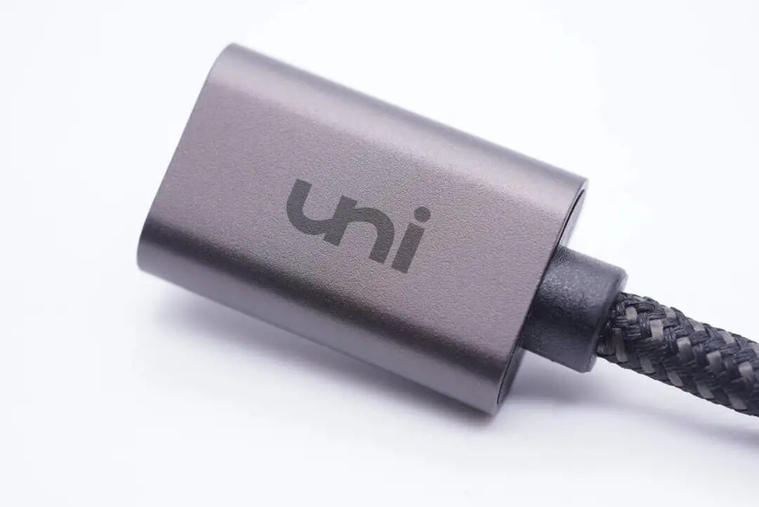转换器两端均采用铝合金外壳包裹,棕色磨砂材质,上面自带uni的品牌Logo。