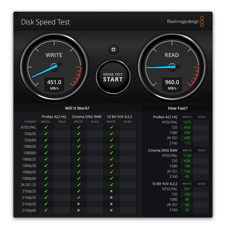 这里还测试了一下传输速度,使用转接器连接MacBook Pro和USB3.0的A to C线材,然后连接型号为M04的硬盘盒,硬盘盒放置的是台电的型号为SD128GBNP900-2280硬盘,最后实测传输写入速度为451MB/s,读取速度为960MB/s。