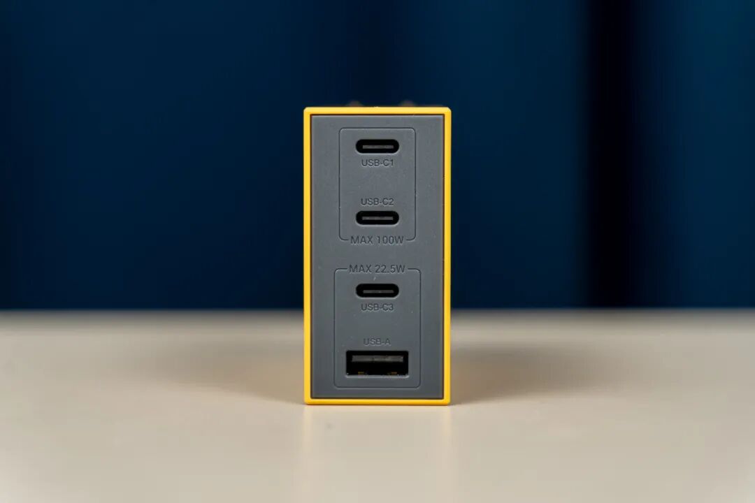充电头的正面有四个接口,上面两个C1、C2口,单口最大100W,下面两个是C3口和A口,最大支持22.5W输出。