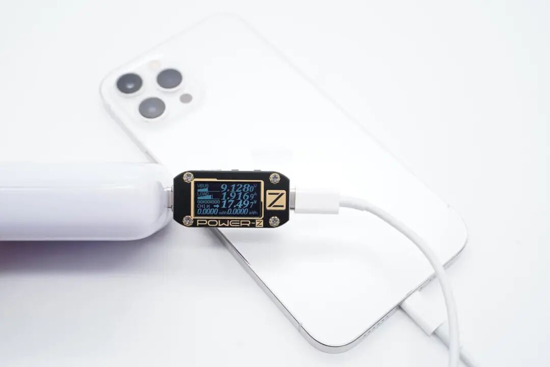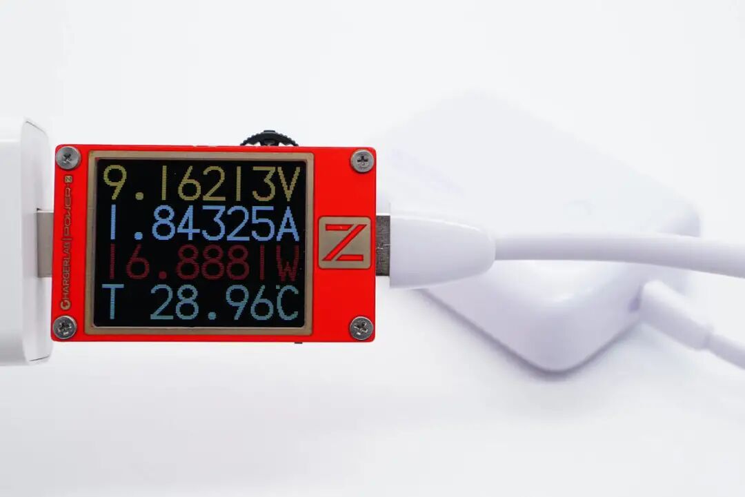 进入实测环节,USB-C支持9V2.2A输出档位正是为iPhone 12的机型准备的,实测为iPhone 12 Pro Max充电功率为9.12V 1.91A 17.49W。