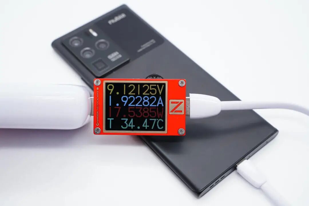 USB-A这里为努比亚Z30 Pro充电功率为9.12V 1.92A 17.53W,握手QC快充。