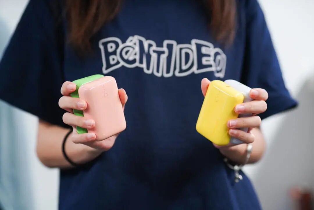 这是办公室的女生手里拿着移速20W迷你充电宝,一只手拿着毫无压力。