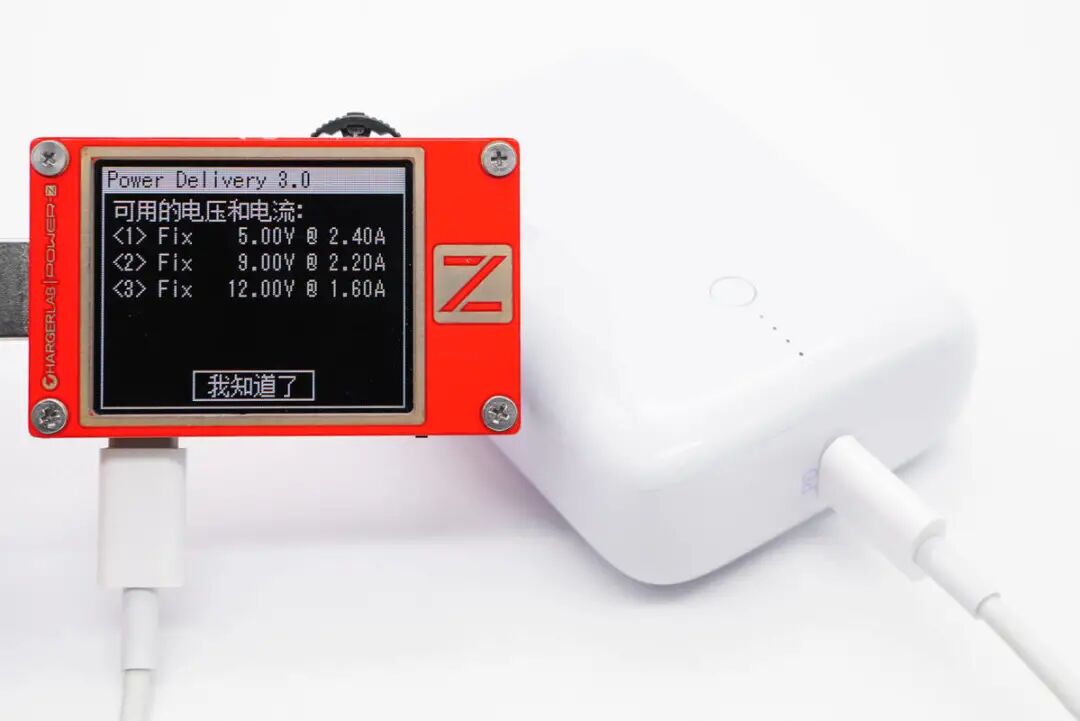 当触发PD快充输出时可以提供5V2.4A、9V2.2A、12V1.6A三个固定电压档位,支持最高20W的输出功率。