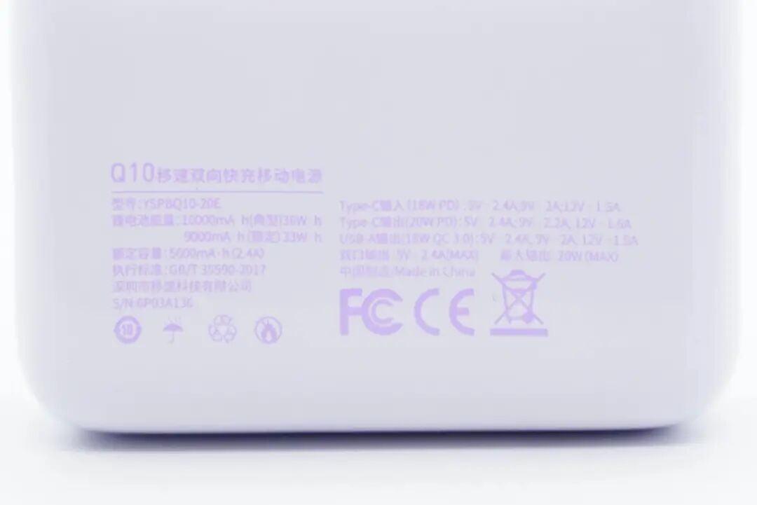 移速新款20W迷你充电宝的型号为YSPBQ10-20E,内置10000mAh的电池容量,36Wh的电池能量。