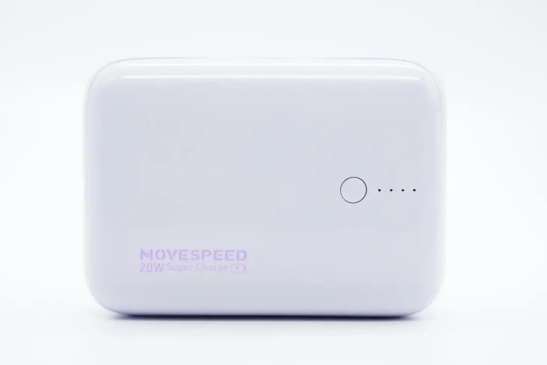 下面就以罗兰紫款作为代表,来细讲解一下移速最新推出的这款超MINI的快充充电宝。移速20W迷你快充充电宝整体的造型较为圆润,体积较小,这样握在手上也更舒服。正面电源按键和指示灯呈直线排列,左下角是MOVESPEED的品牌Logo,以及20W快充的相关标识。