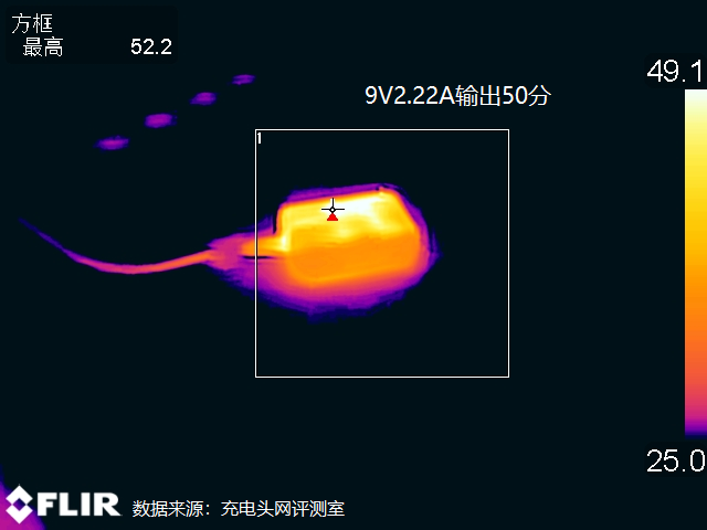 让充电宝以9V2.22A 20W的功率持续输出50分后采集到充电宝表面的最高温度为52.2℃。