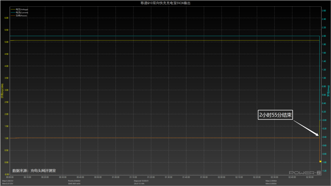 首先让充电宝以5V2A 10W的功率持续输出,全程耗时约2小时55分。放出的能量约为29.6115Wh,所以充电宝在以5V2A 10W的功率输出时的效率约为29.6115/36=82.25% 。
