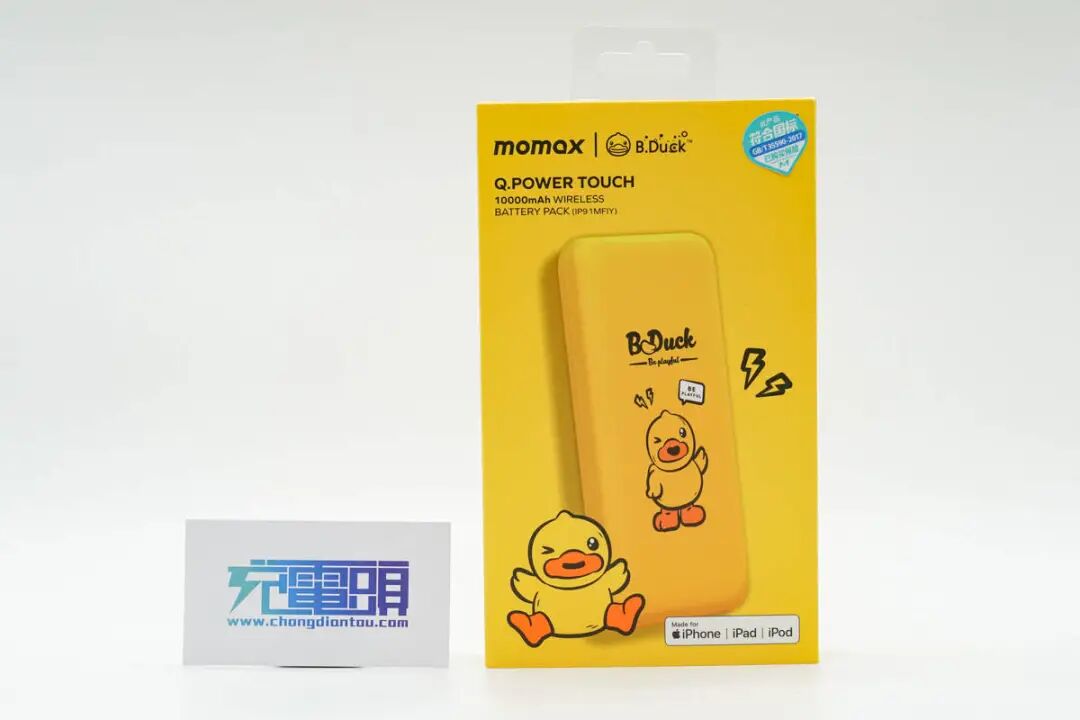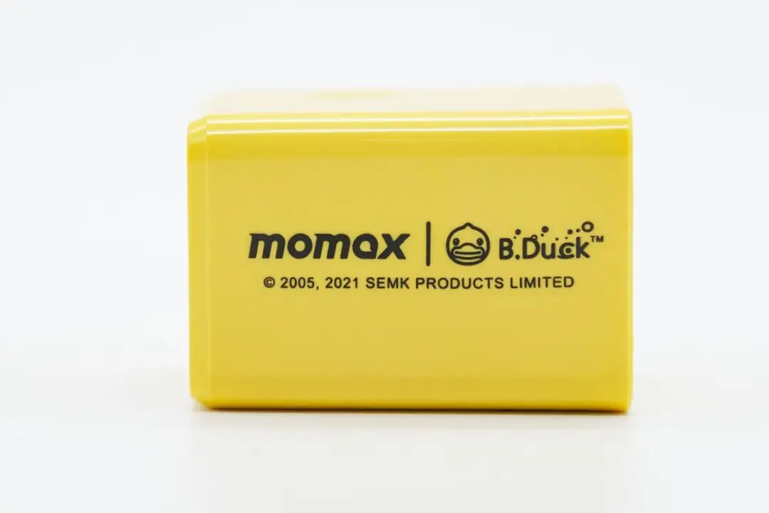 壳体的一侧,印制着MOMAX和小黄鸭的品牌Logo以及时间段。