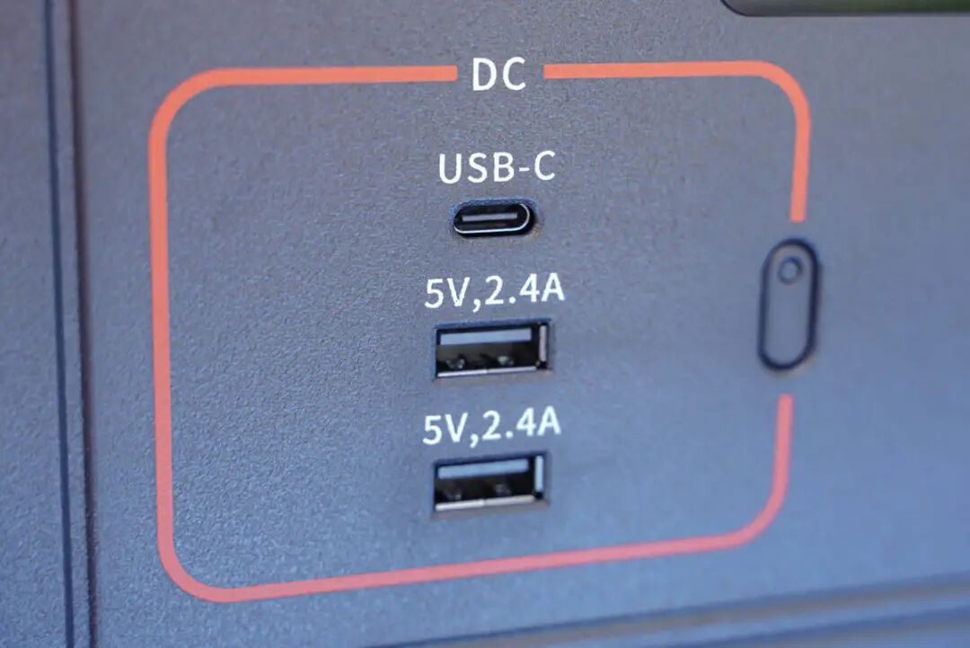 这是1100 Pro的DC接口部分,黄色的线条将不同的充电区域划分出来,并带有独立按键控制开关。1100 Pro同样配备了2C2A共4个USB快充接口,其中USB-C支持18W快充,可以为包括iPhone在内的数码设备提供PD快充服务。USB-A支持18W QC快充,可以为安卓机型提供快充服务。