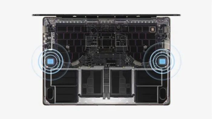 辅助的Touch Bar被取消,一排全高的F功能键取代了Touch Bar。右上角仍然有一个Touch ID指纹传感器,键盘也采用了MacBook Pro 2021的新设计,整个键盘区域是黑色的。