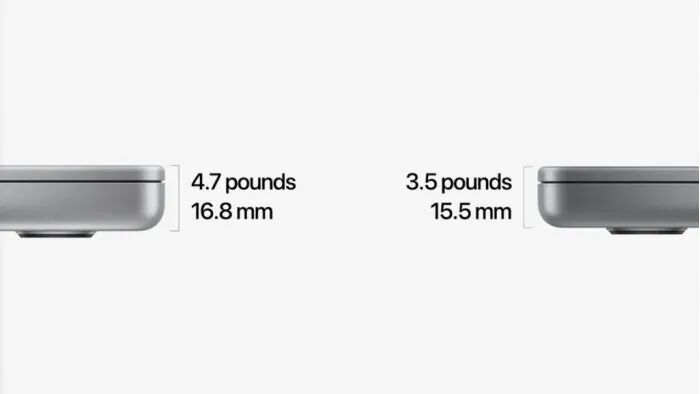 14 英寸机型仅 15.5 毫米厚,重 3.5 磅,16 英寸机型为 16.8 毫米厚,重 4.7 磅。