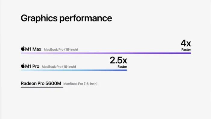 与此前的 AMD GPU 方案相比,M1 Max 和 M1 Pro 的性能分别领先 4X / 2.5X 。