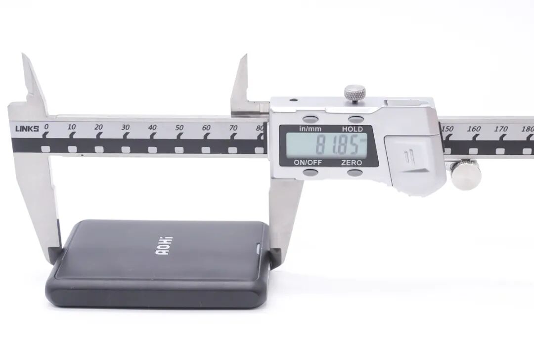 三围参数方面,使用卡尺实测充电宝的长度约为81.85mm。