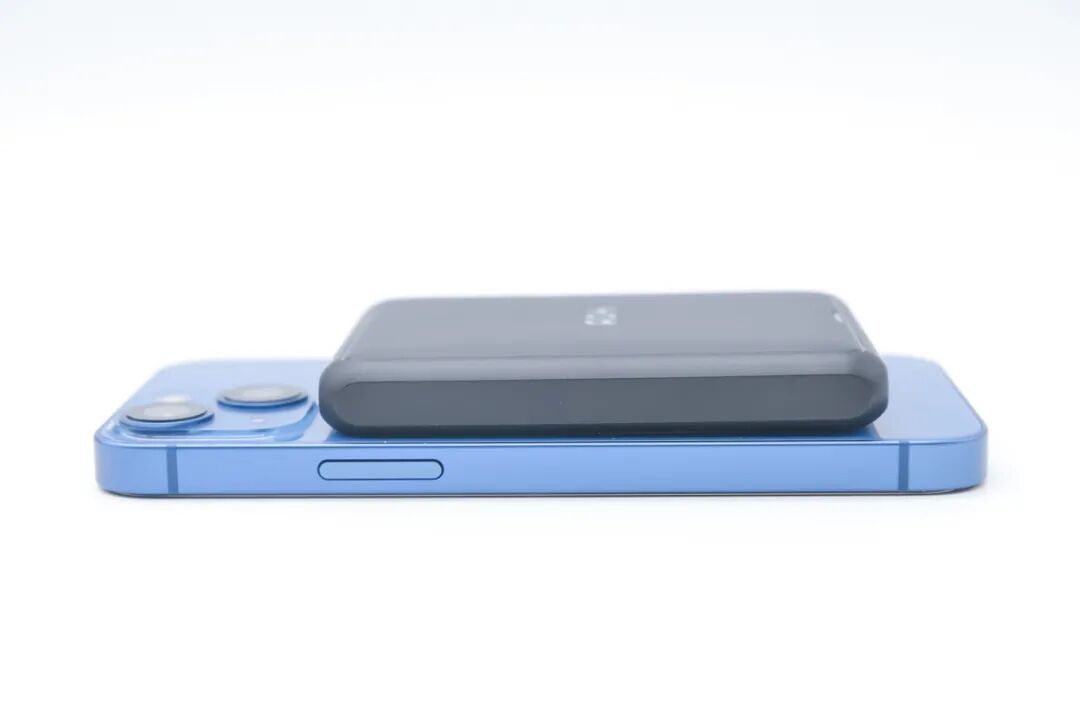 这是搭配最小的5.4英寸的iPhone 13 mini的使用场景,可见充电宝的外壳相较于手机的镜头模组中间还有空间。